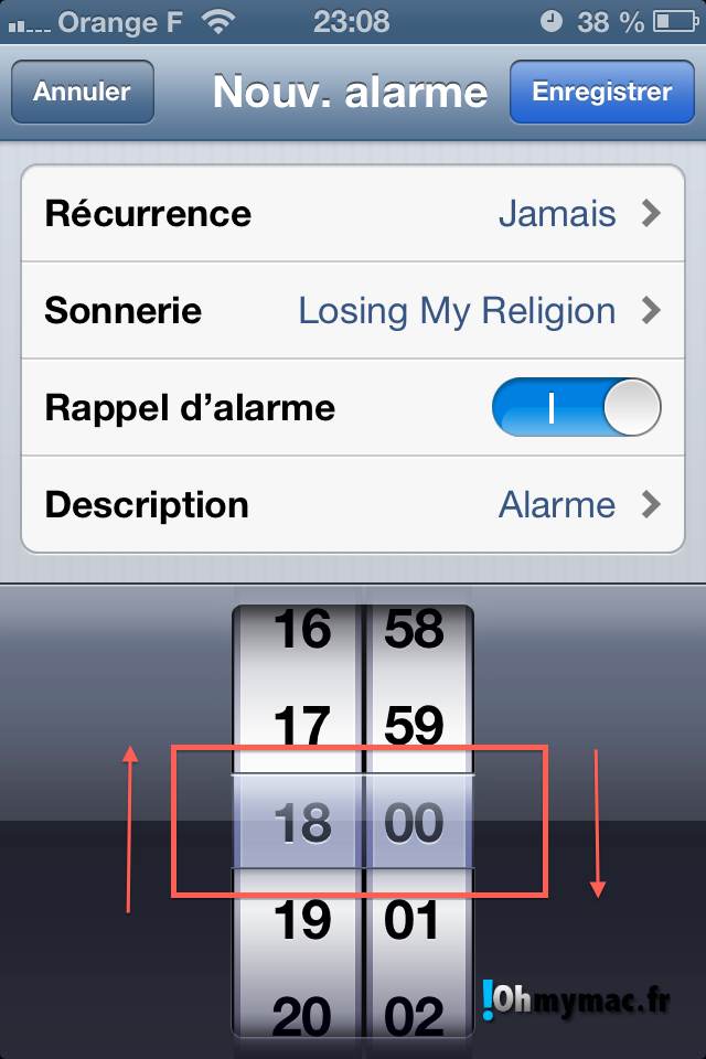 De retour dans les options de l’alarme, nous voyons que la chanson est bien sélectionnée comme sonnerie. Ne pas oublier de modifier les autres options au besoin: récurrence, rappel, description. Évidemment, il faut également régler l’heure à laquelle vous souhaitez que l’alarme sonne, en utilisant le défilement des heures et les minutes en bas.