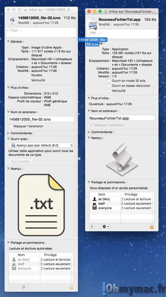 Cliquez droit sur le fichier ICNS et dans le menu contextuel choisissez « Lire les informations ». Une nouvelle fenêtre d’information va s’ouvrir. Laissez la ouverte et continuez.