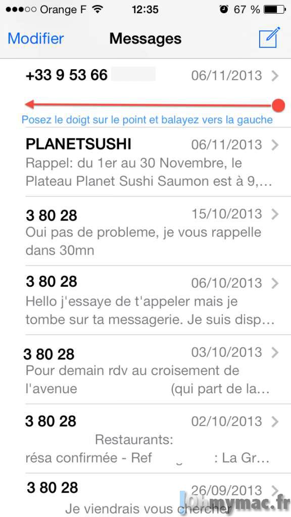 Nous sommes revenus dans la liste de toutes les conversations SMS/iMessage. Et nous voulons supprimer une conversation entière, par exemple, celle tout en haut. Pour cela, il faut poser le doigt sur la conversation, par exemple là où nous avons posé le point rouge et balayer avec le doigt vers la gauche.