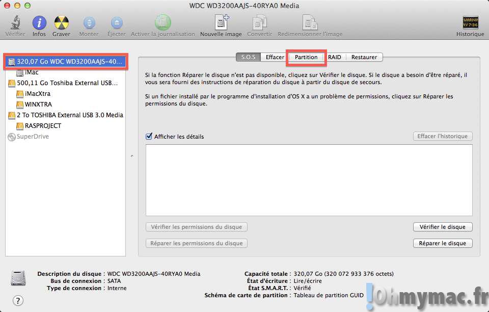 Choisir le disque que vous souhaitez partitionner dans le panneau de gauche, ici nous choisissons le disque dur principal de ce Mac. Il faut bien penser à choisir le disque dur (celui qui a le nom matériel ici WDC WD3200AAJS) et non la partition actuelle (ici iMac). Dans le panneau de droite choisir l’onglet Partition.