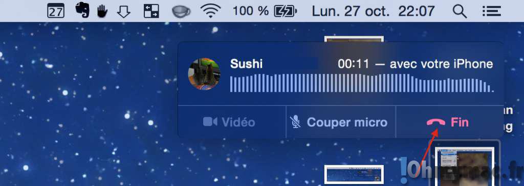 Lorsque l’appel commence, la conversation est représenté par de petites barres animés comme sur un équaliseur. A tout moment vous arrêter l’appel en cliquant sur « Fin ». Vous pouvez aussi couper le micro pour empêcher l’interlocuteur d’entendre ce que vous faites pendant un moment. Enfin si l’interlocuteur a accès à Facetime, vous pouvez basculer en appel Vidéo.