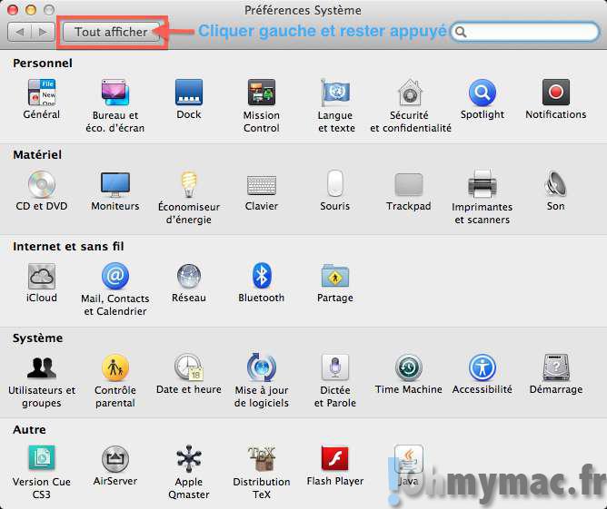 Une fois arrivé dans les préférences, repérez le bouton « Tout afficher » tout en haut. A présent cliquez sur ce bouton et restez appuyé.
