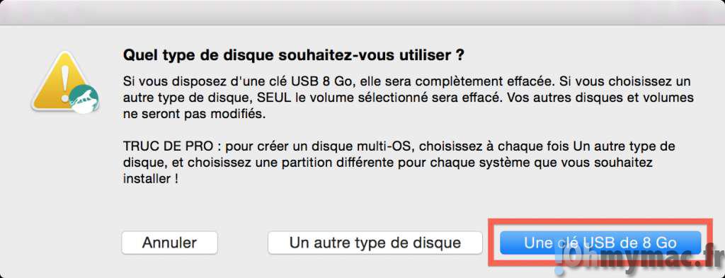 A présent, choisissez le type de disque sur lequel vous voulez créer votre clef de démarrage pour El Capitan. Nous allons utiliser une clef USB de plus de 8Go que nous avons pris soin de brancher à notre Mac. Cliquez sur le bouton adéquat qui correspond à votre situation.