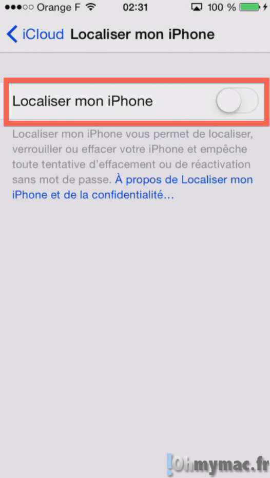 En principe, si vous avez choisi une configuration standard, l’option Localiser mon iPhone (ou iPad) doit être activé avec l’interrupteur à droite. Pour les besoins de ce tutoriel, nous avons besoin de désactiver ce service (nous le réactiverons plus tard). Passez l’interrupteur à gauche pour désactiver le service.