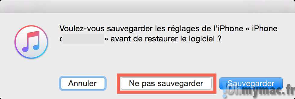 Vous aurez peut être un avertissement comme ci-dessus car votre appareil va être entièrement effacé. Comme nous avons déjà fait une sauvegarde, il n’est pas nécessaire d’en faire une nouvelle, donc vous pouvez cliquer sur « Ne pas sauvegarder ».