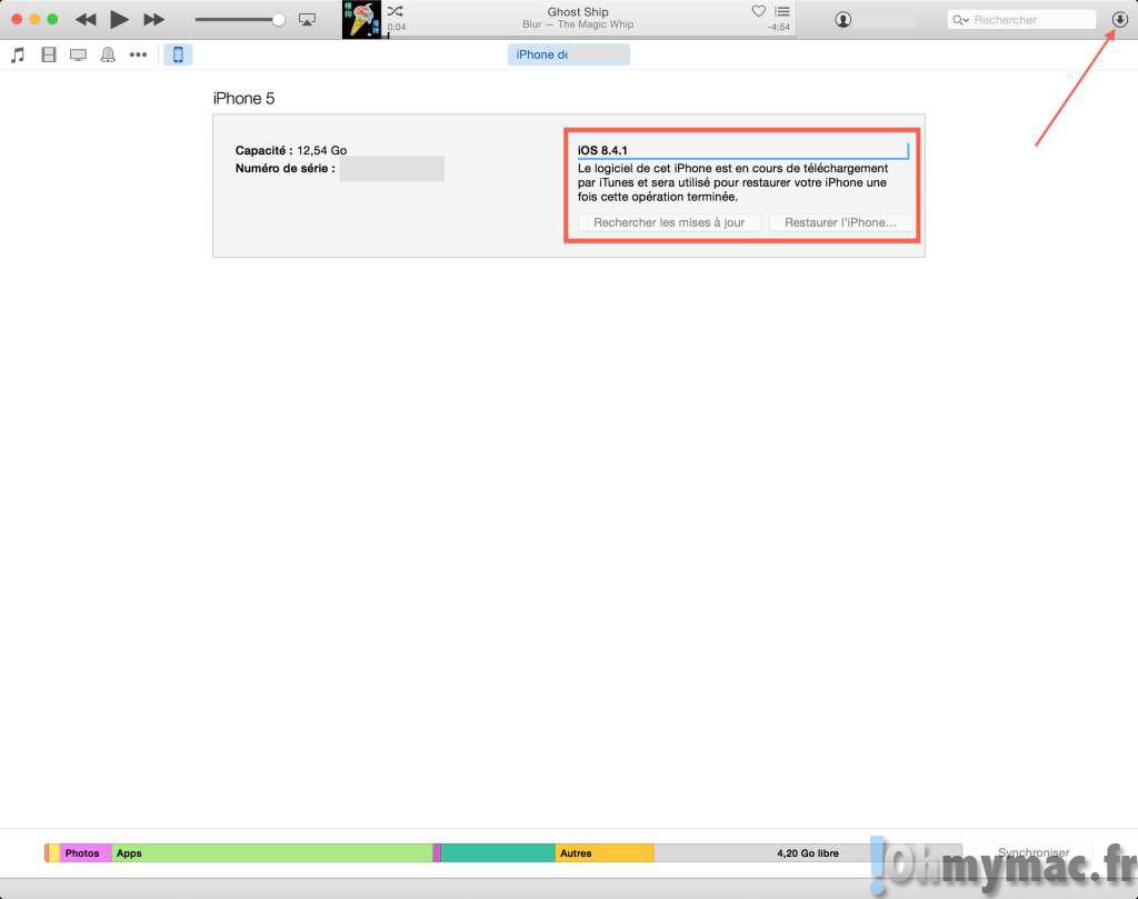 Si vous trouvez le temps long, vous pouvez cliquer sur le bouton tout en haut à droite en forme de flèche vers le bas: iTunes vous signalera alors où il en est du téléchargement d’iOS.