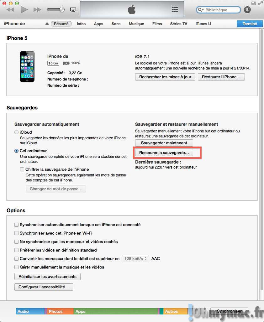 Vous arrivez alors sur l’interface d’iTunes correspondant à votre appareil, ici un iPhone 5. Dans l’onglet « Résumé » de cette interface (c’est l’onglet ouvert par défaut), il y a un espace consacré aux Sauvegardes. Vous avez le choix entre une sauvegarde sur l’ordinateur actuel ou une sauvegarde sur le service en ligne d’Apple, iCloud. Ici nous allons effectuer une sauvegarde sur l’ordinateur, donc nous choisissons « Cet ordinateur », puis plus à gauche nous cliquons sur « Sauvegarder maintenant ». Pour faire une sauvegarde iCloud, il suffit d’utiliser l’autre option. Il vous faudra un identifiant iCloud et cela risque de prendre plus de temps.