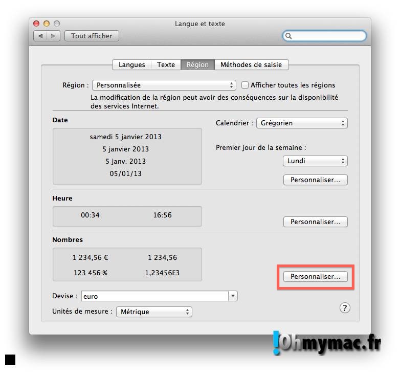 Dans l’onglet Région, tout en bas, repérer la partie consacrée aux Nombres et cliquez sur le bouton Personnaliser: